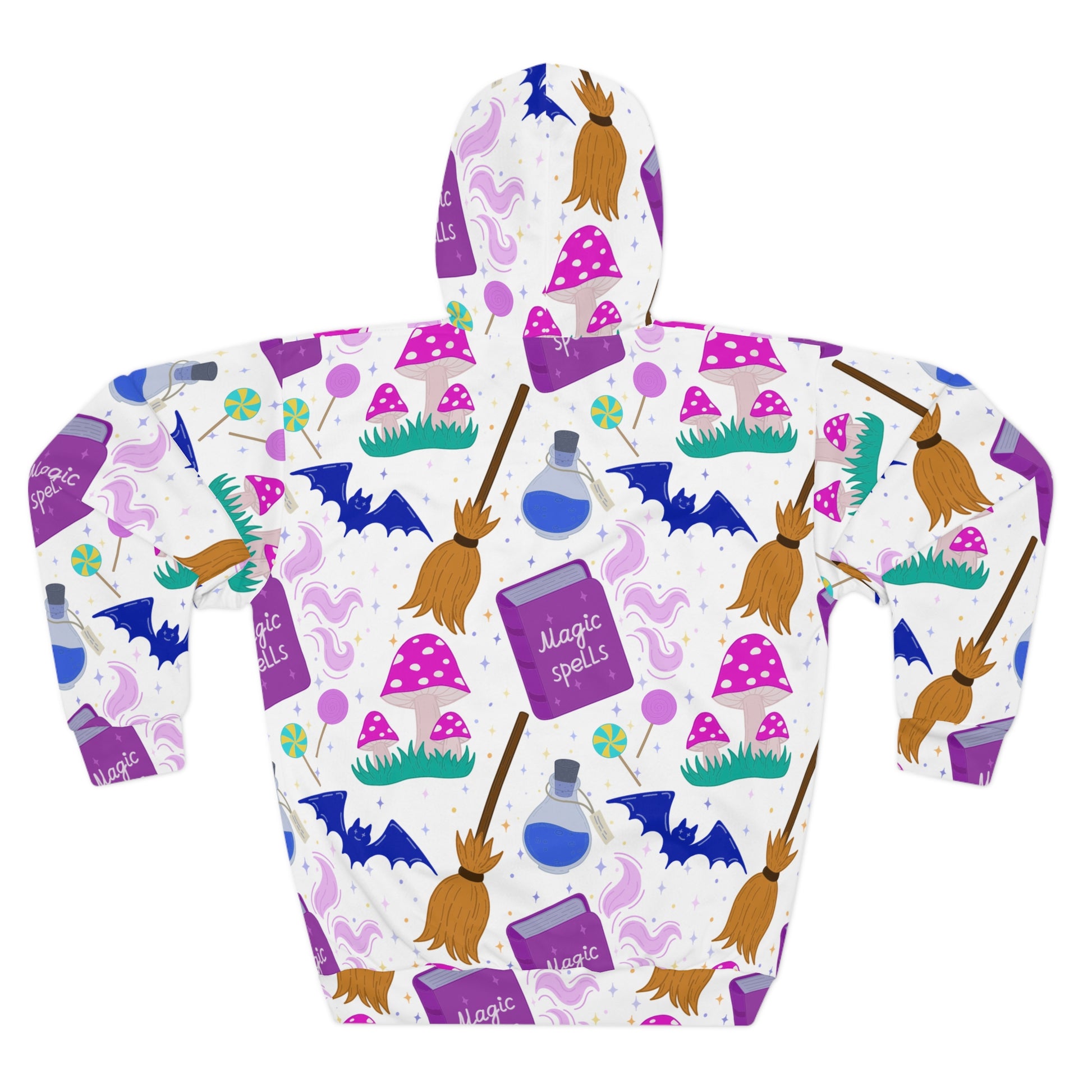 Embrace the whimsical charm of this Unisex Pullover Hoodie, perfect for cozy nights in or adventurous days out. With its vibrant all-over print featuring enchanting designs of magic spells and whimsical elements, this hoodie adds a playful touch to any outfit. The spacious kangaroo pouch pocket will keep your hands warm, making it an excellent companion for chilly evenings. Adjustable with a drawstring hood, it allows for a perfect fit to shield you from breezy weather. Crafted from durable, quick-drying polyester, this hoodie offers both comfort and style. Ideal for anyone who loves a sprinkle of magic in their wardrobe, it's a thoughtful gift for Halloween celebrations, casual gatherings, or just enjoying a cozy day at home.