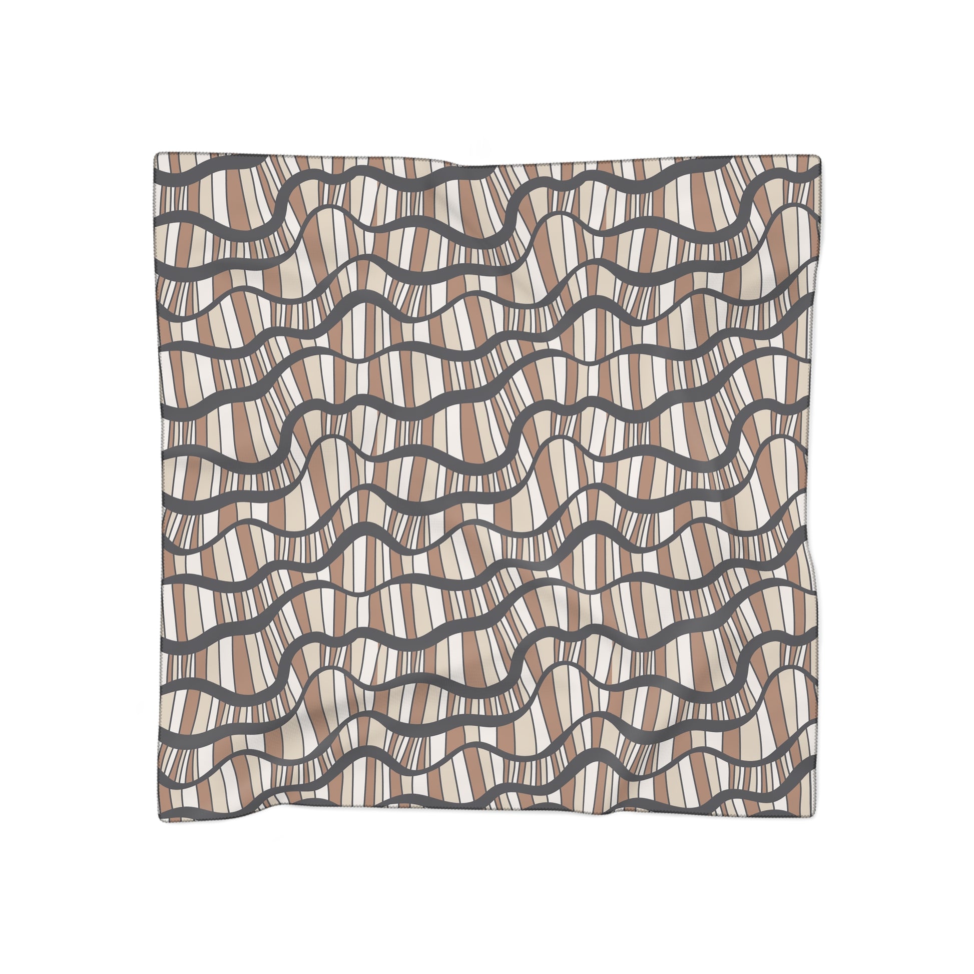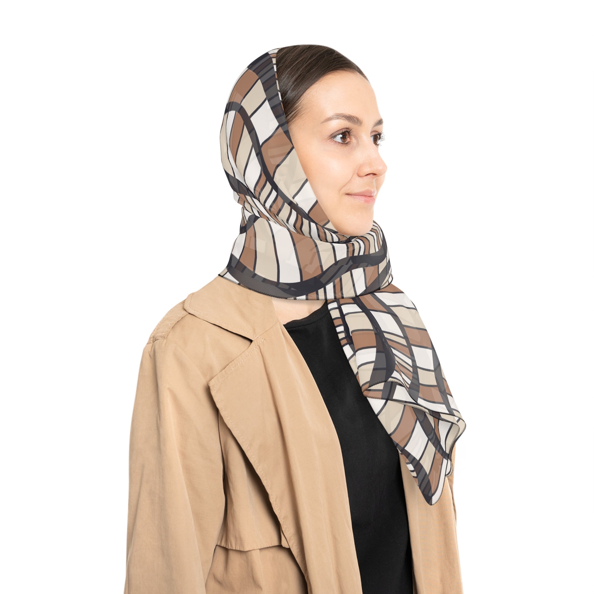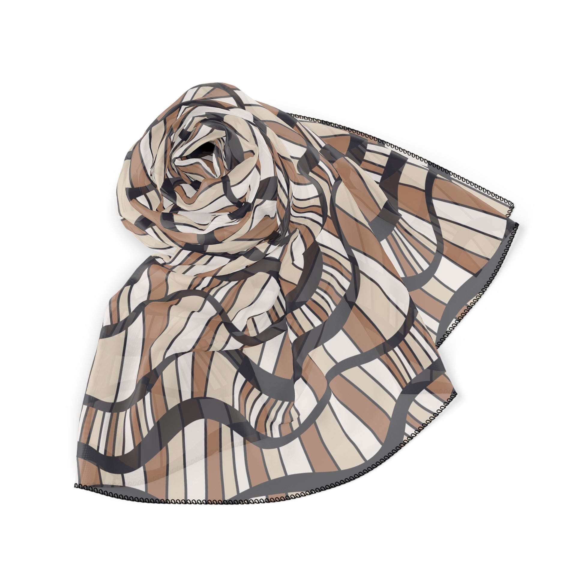 This Shifting Dunes scarf is made from 100% Polyester, offered in Poly voile and Poly chiffon. Both fabrics provide a breathable finish and elegant flow. Its wave-inspired design mirrors sand dunes in motion, making it a timeless piece to elevate your outfit with subtle movement and grace.